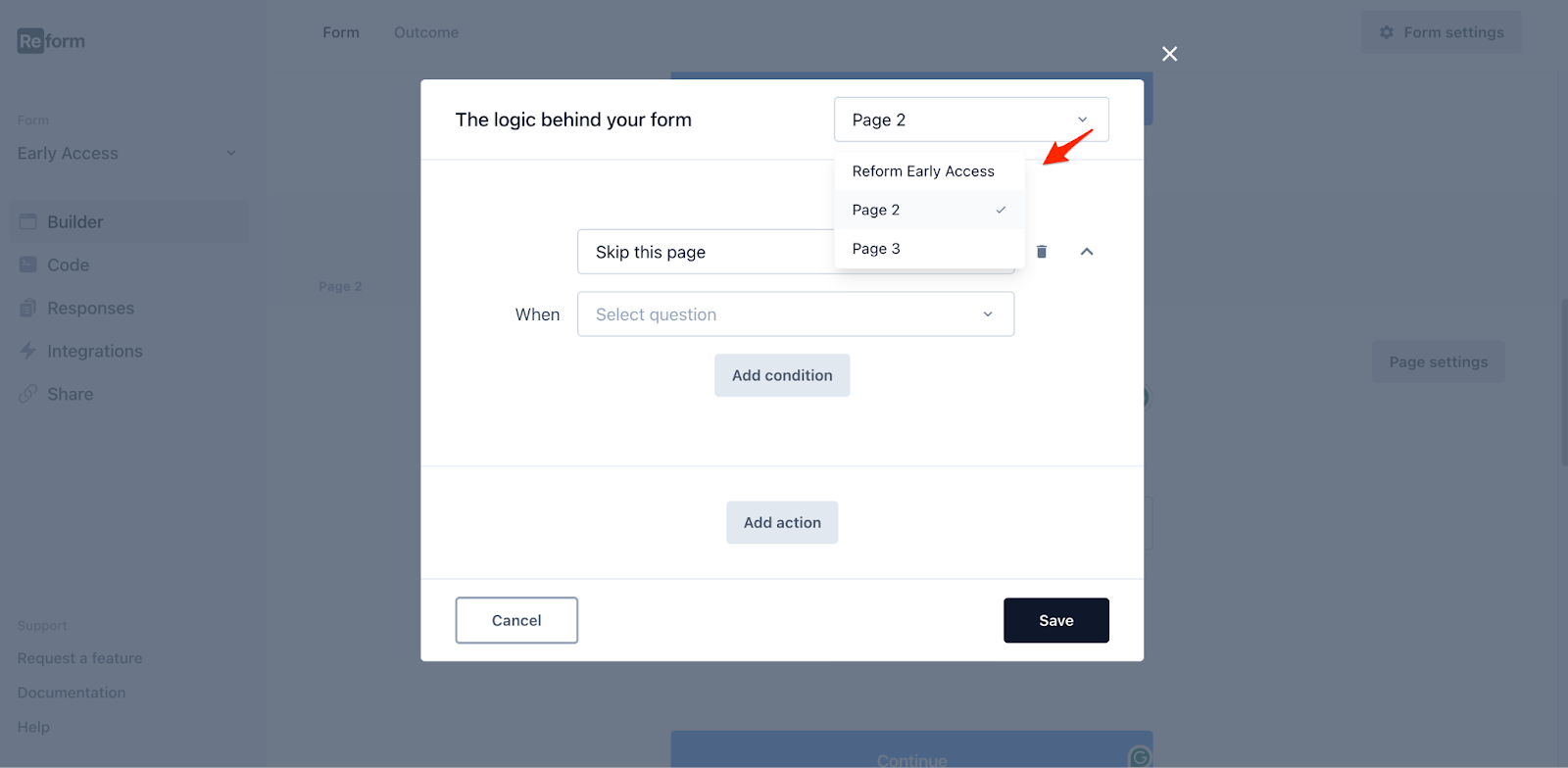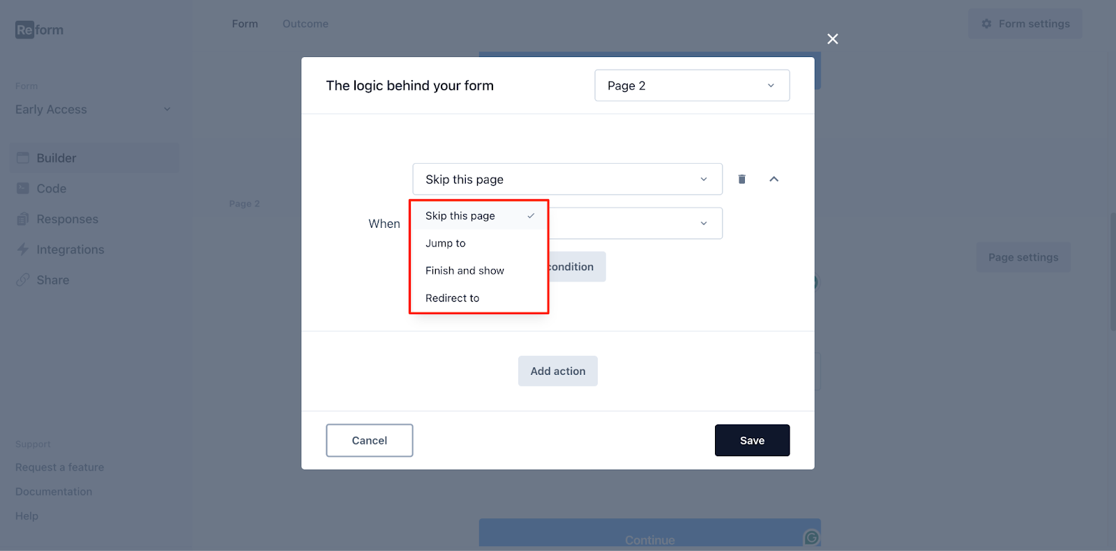 - Skip this page: Skip a specific page if certain conditions are met. This option is only valid for pages after the first one (e.g., page 2, page 3, etc.).