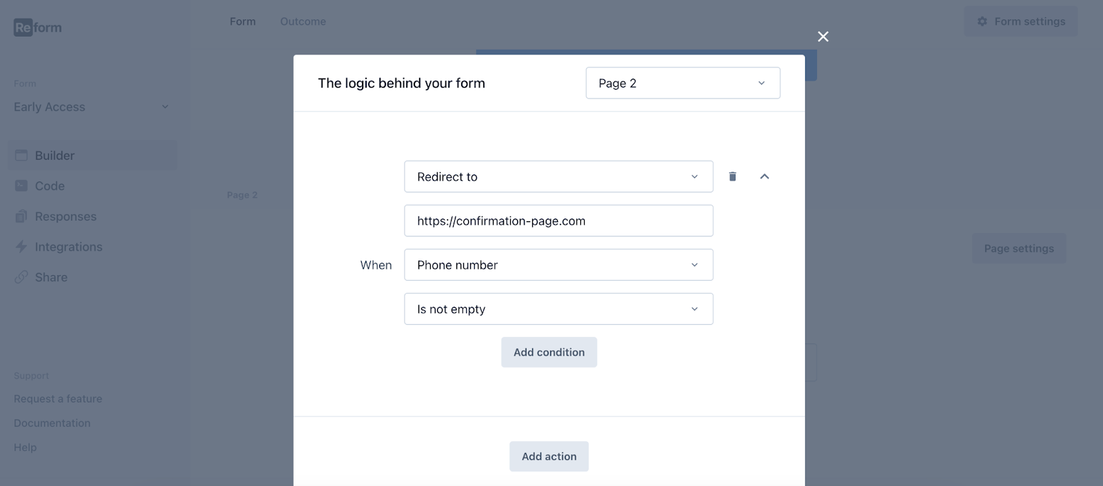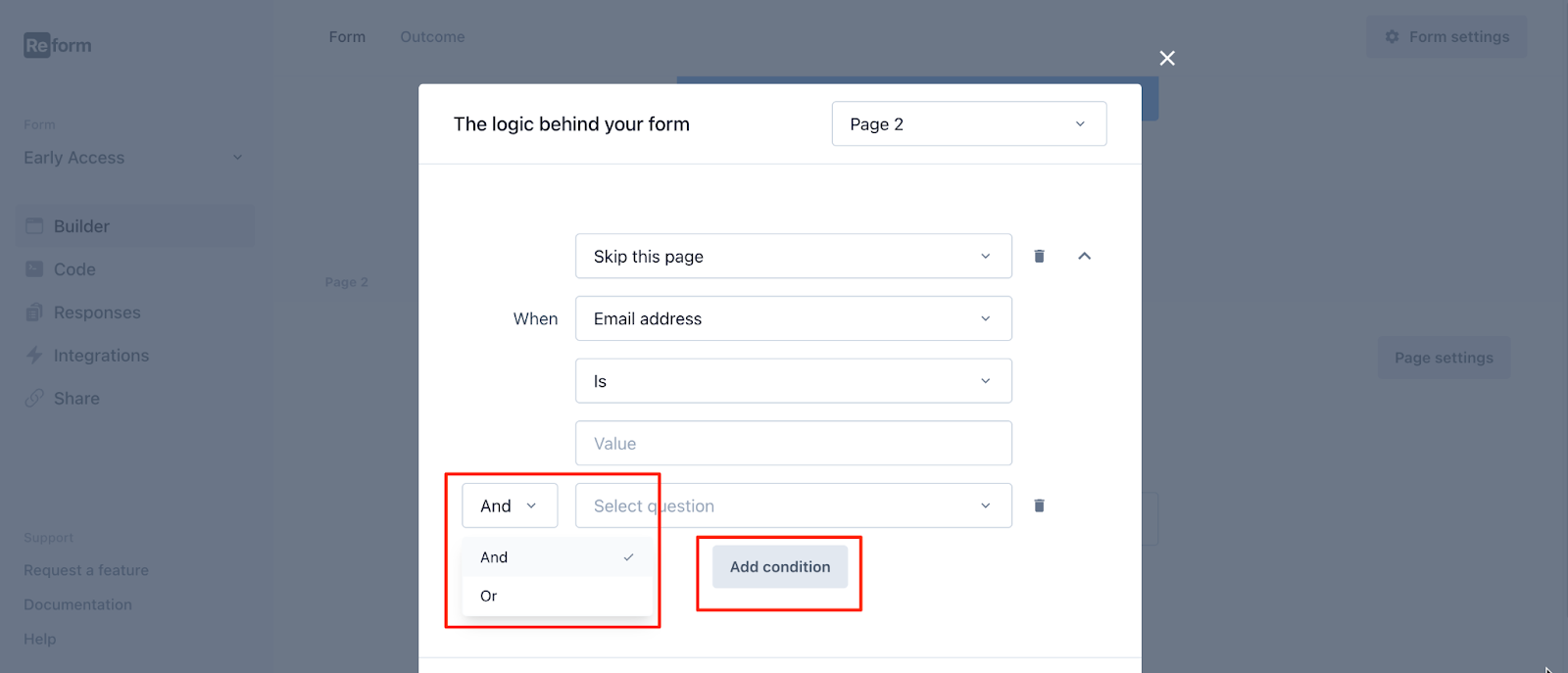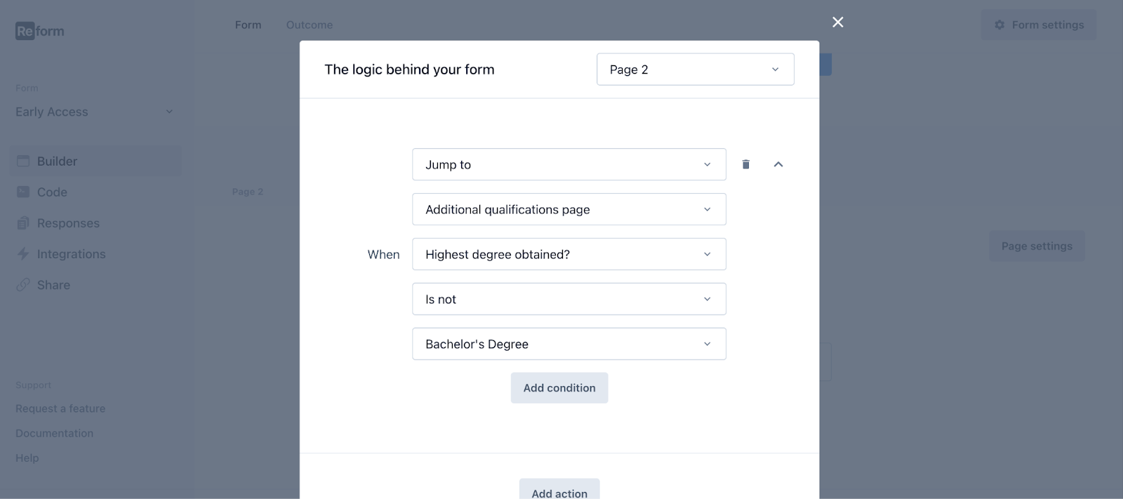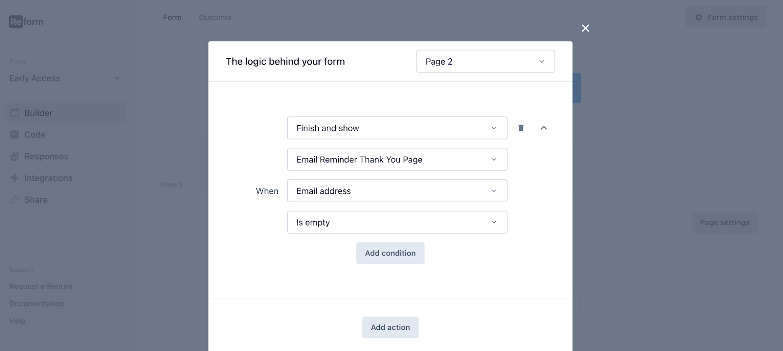 The "Add condition" feature allows you to create complex and detailed logic rules by combining multiple criteria for the same logic action. This enables your form to respond accurately to various respondent inputs, ensuring a tailored and relevant experience. Here’s how you can effectively use the "Add condition" feature: