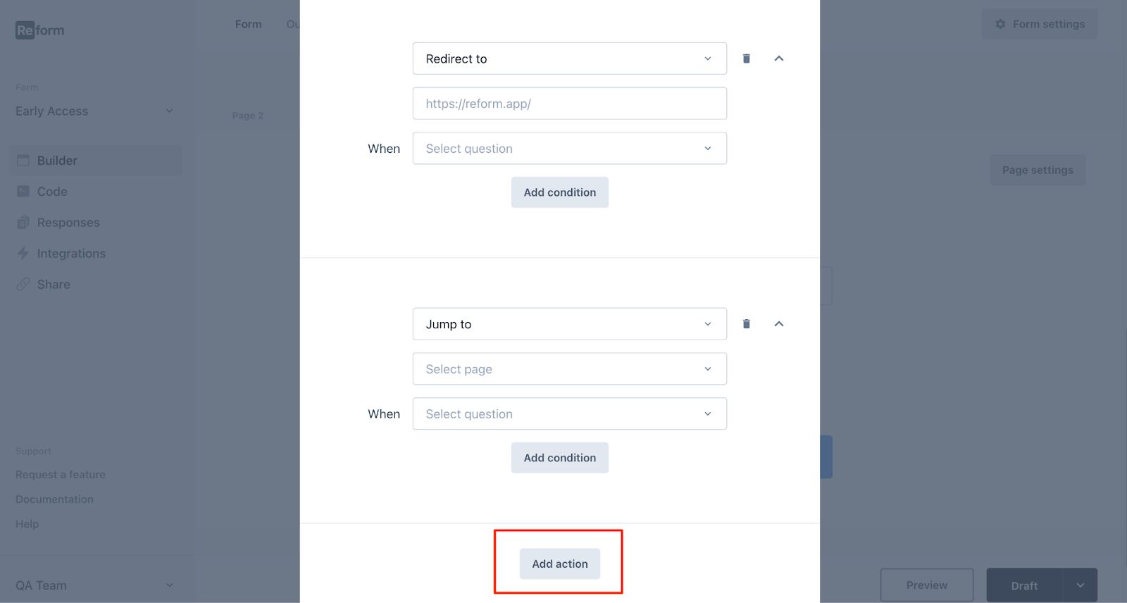 - Click "Add Action": After setting up your first logic rule, click the "Add action" button located below the existing logic setup fields.