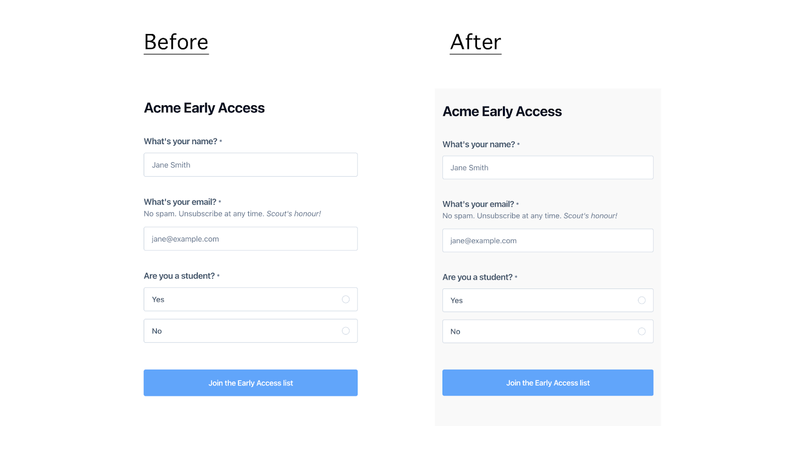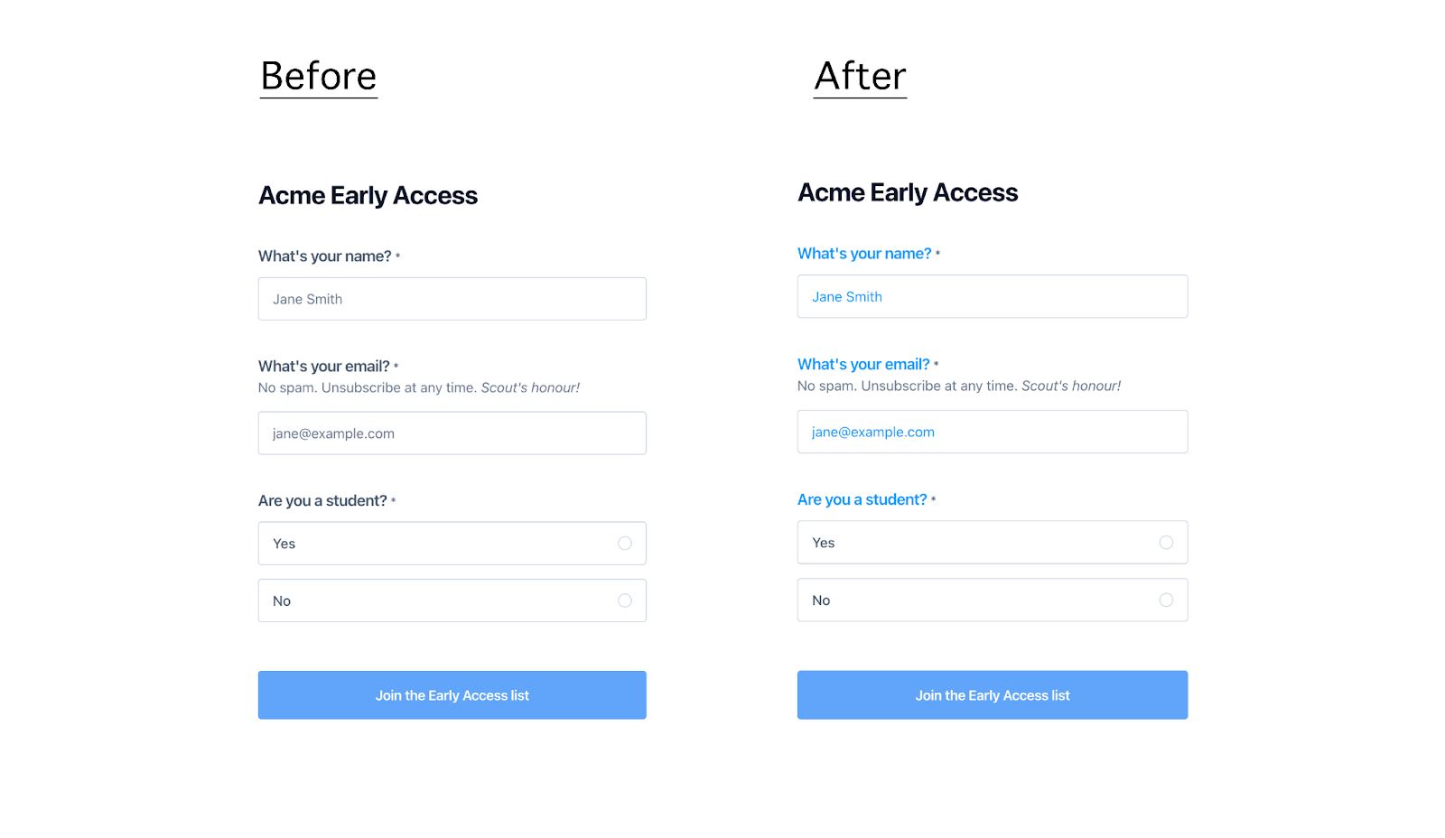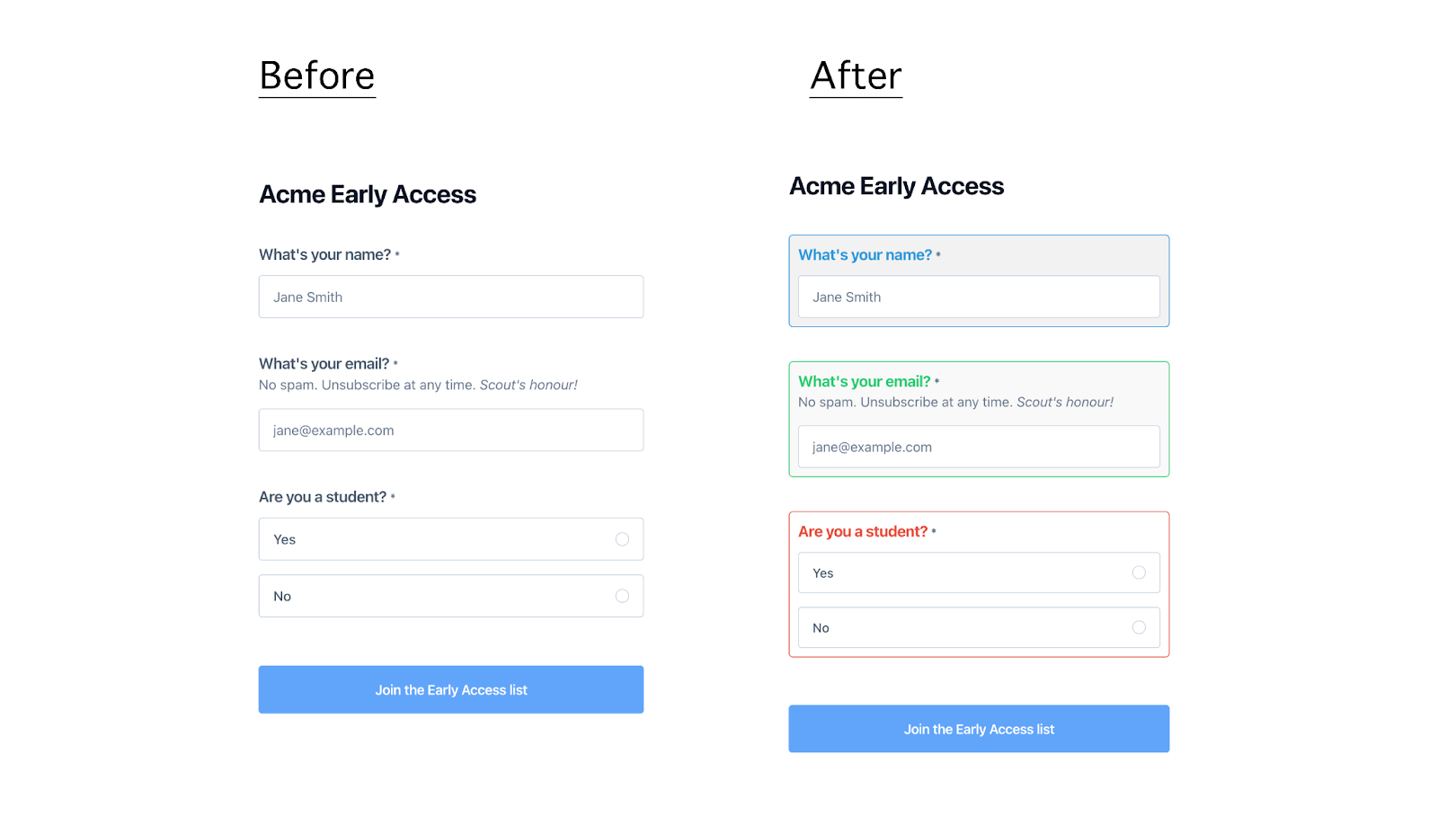 Use Case: Customize the appearance of several form elements (e.g., name, email, and single-select fields).