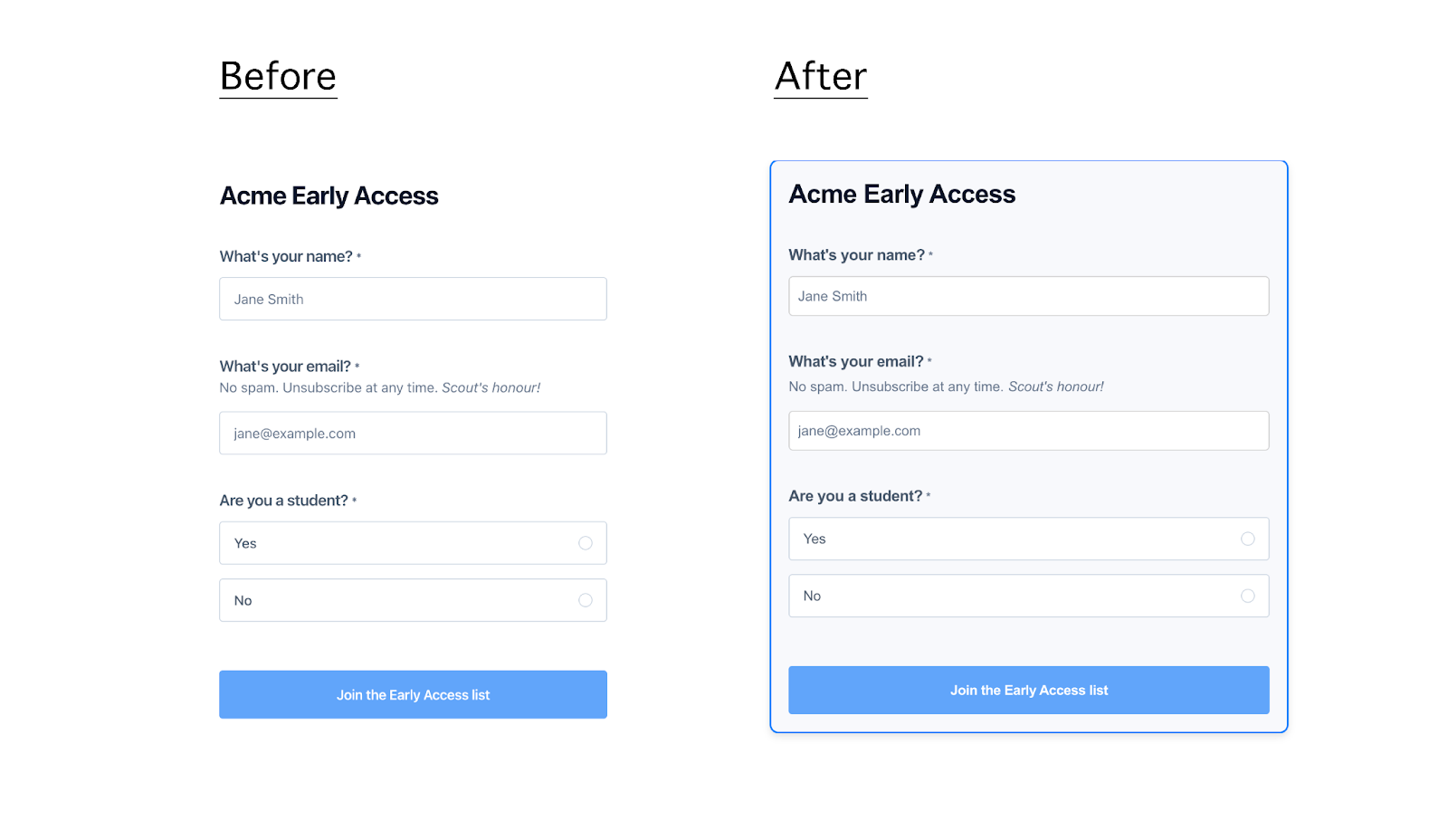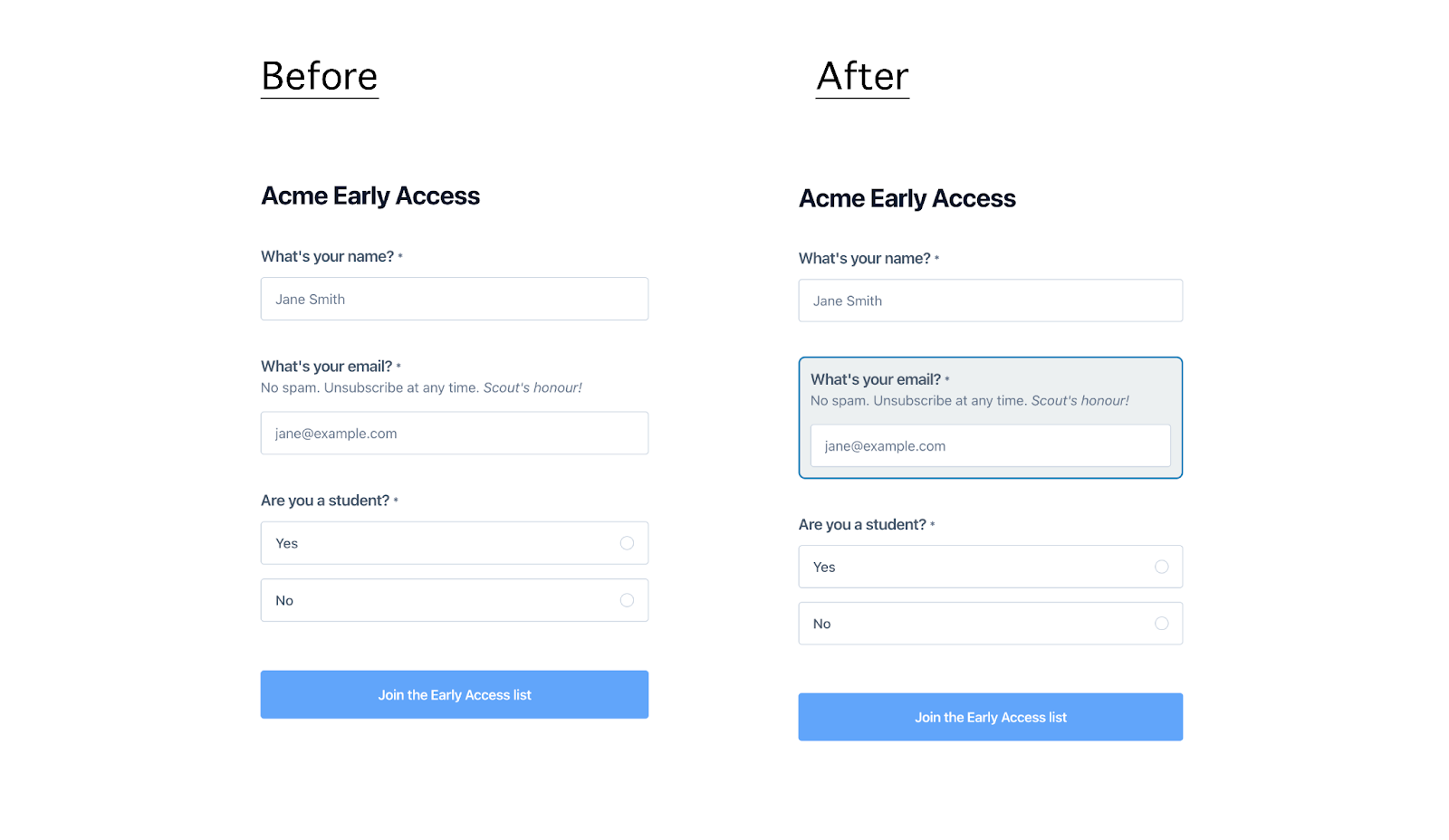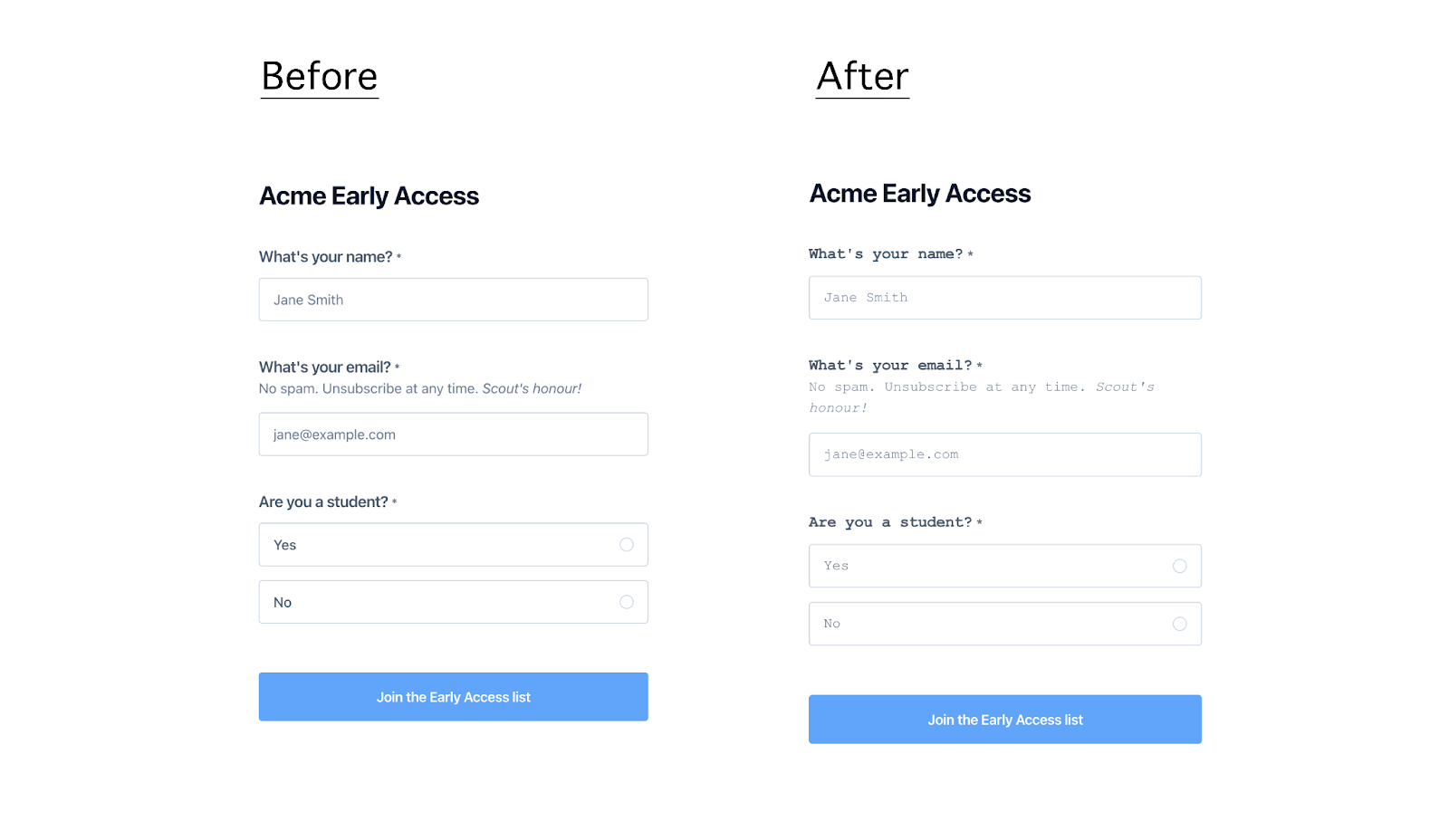 Use Case: Customize the appearance of several form elements (e.g., name, email, and single-select fields).