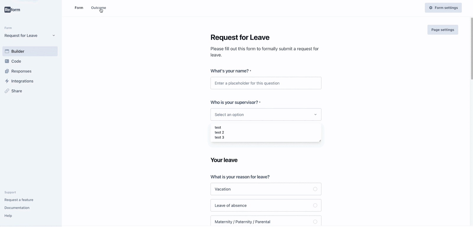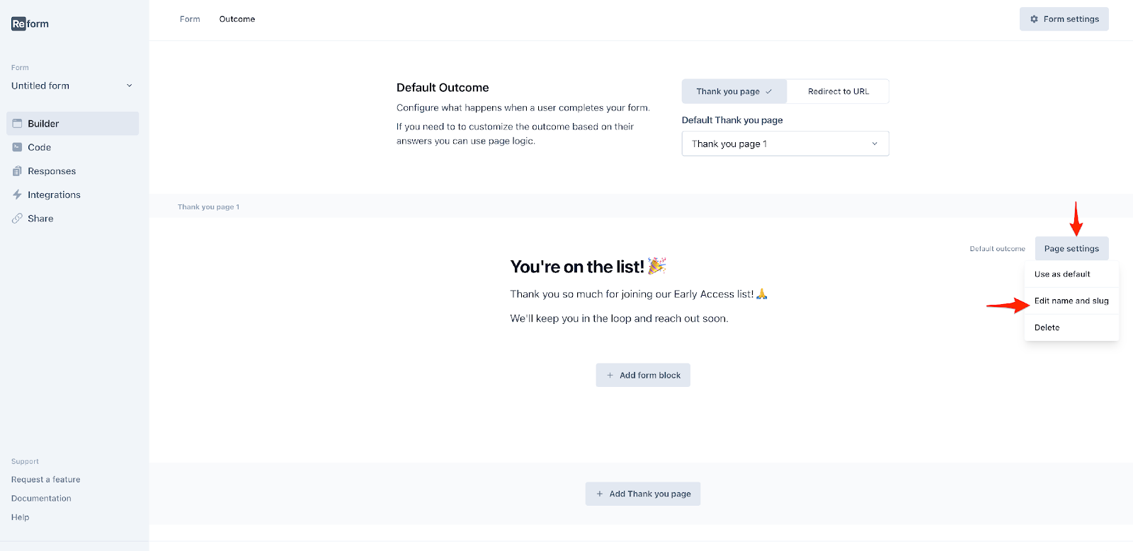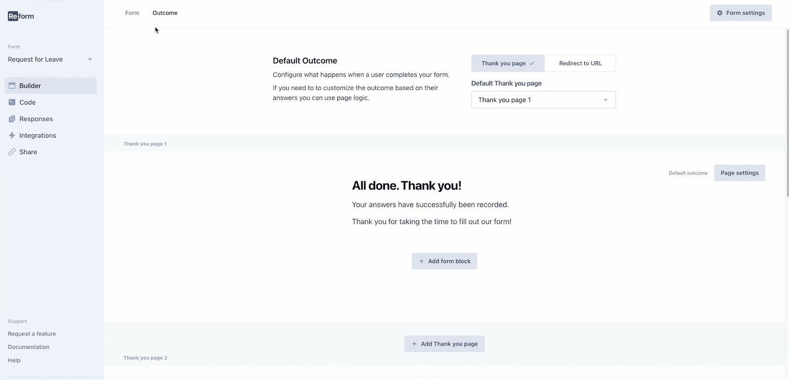 Thank you pages, referred to as "Outcomes" in Reform, are a very important element of your forms. They set the right visitors' expectations, address next steps, and keep visitors engaged. Your thank you pages should be clear and on point to effectively communicate with your audience.