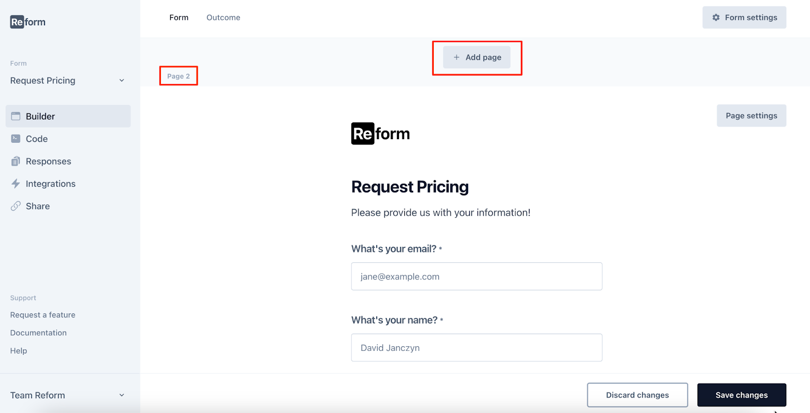 - To make the form easier for users to fill out, add multiple steps. Click on the "Add page" button to add a new step. Duplicate content blocks from the first step and drag them to the next step for consistency. Add new questions for the second step, such as an email block and a name block.