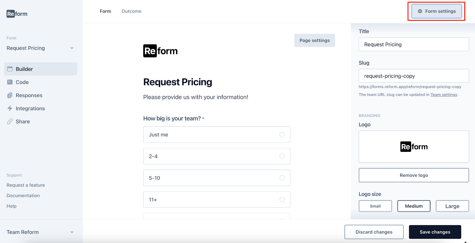 - Use the form settings to add your logo, change the color of the CTA button, and update the form slug to make it more descriptive.