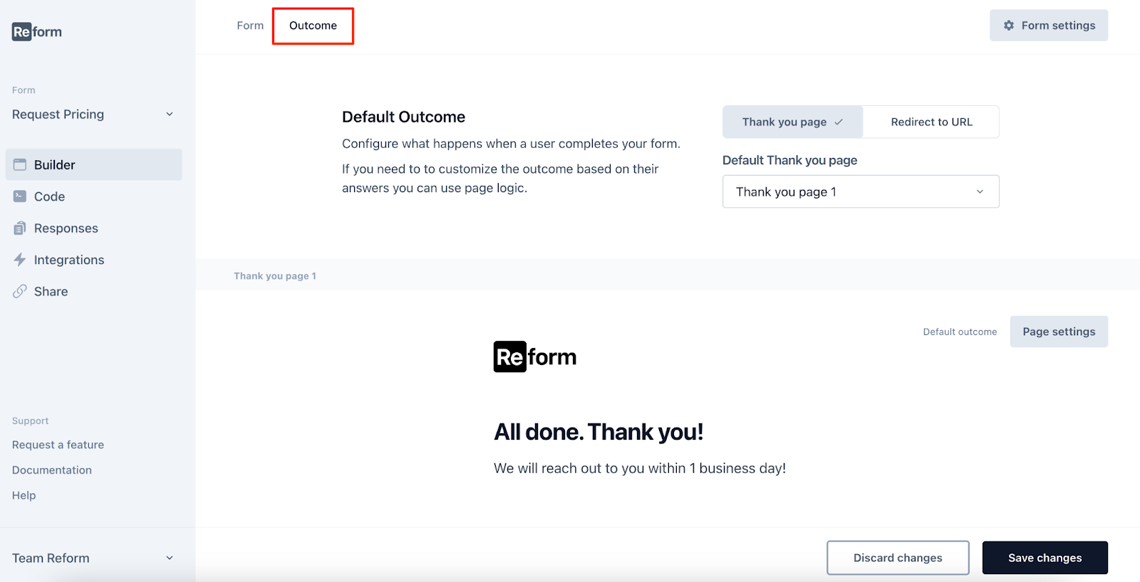 - Customize the thank you message that appears after form submission by clicking on the 'Outcome' option and editing the message.