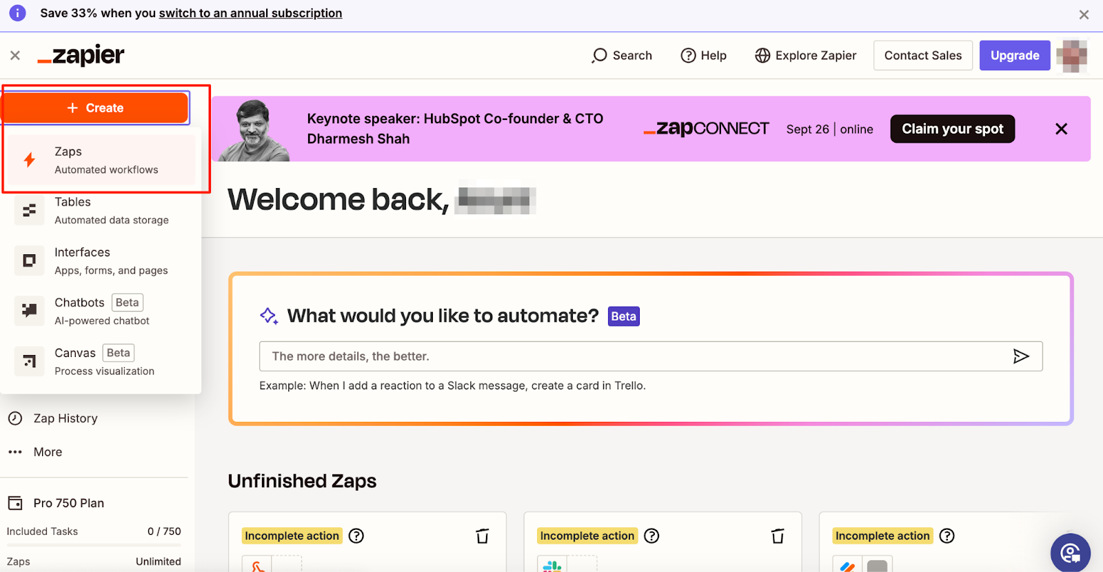 - Select Zaps: From the expanded menu, choose the Zaps option. This will take you to the Zaps creation page.