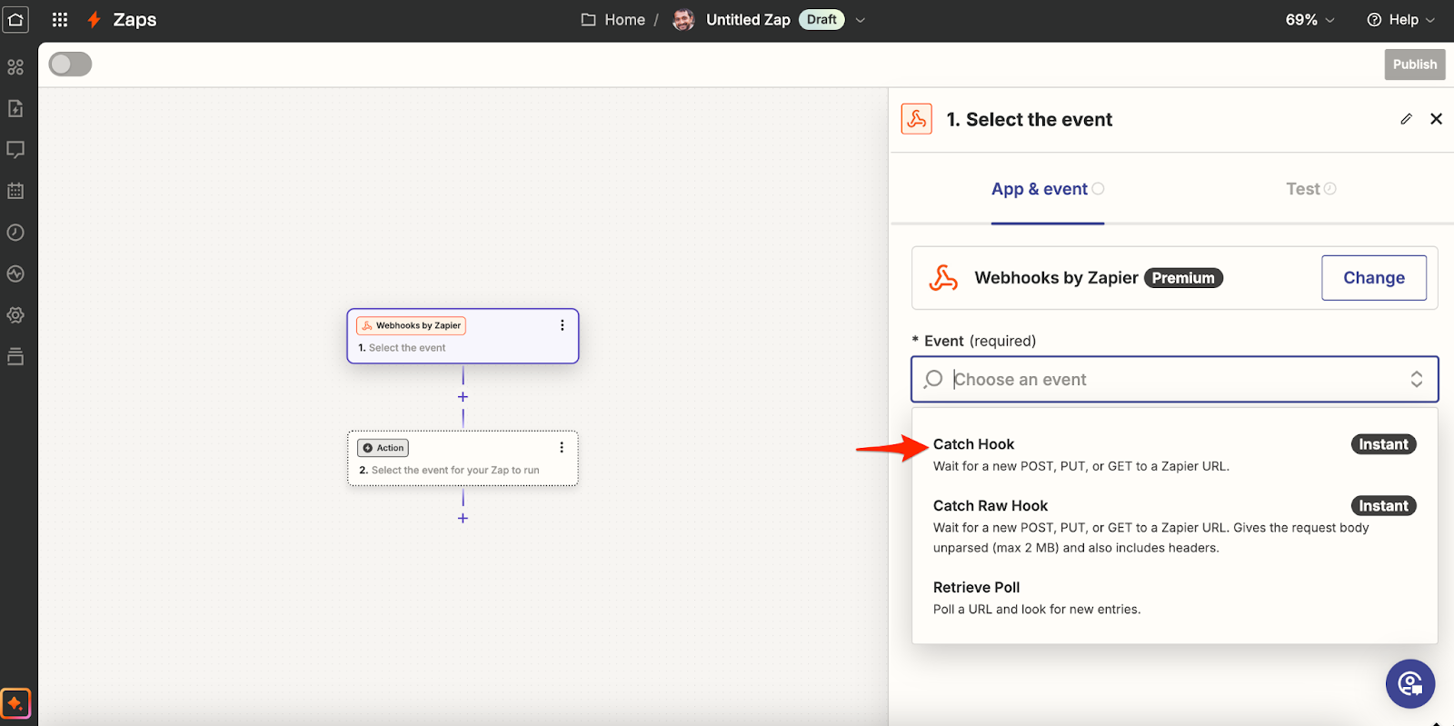 - Select a Trigger Event: From the dropdown menu, choose Catch Hook as the trigger event. This option allows Zapier to receive data from your form when the webhook is triggered.
