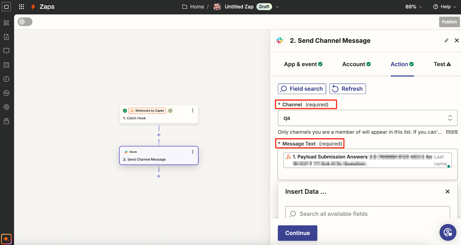 - For Slack, you need to choose the channel where the answers will be sent to and the message that will be sent. Ensure that you map the appropriate form fields to the message content. It’s important to pick the ‘answer’ part.